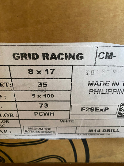 **SET OF 4 ** ON SELLROTA GRID 17X8 5X100 +35 73.1 WHITEBrand/Model: GRIDBolt Pattern: 5X100Offset: +35Hub Bore: 73.1Surface Finish : WHITECondition: New |